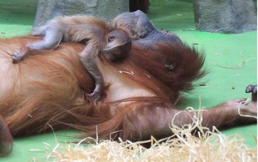 Беременность самки будет длиться 8,5 месяцев. Чаще всего рождается один детеныш орангутана, реже два. Весят новорожденные малыши около 1,5-2 кг. Первое время детеныш крепко держится за шкуру на груди самки, потом для удобства перебирается на спину.