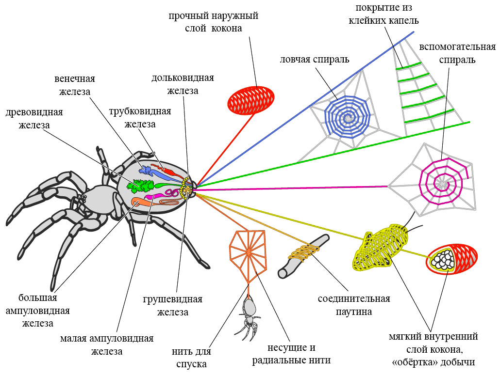Рисунок 4. Типы паутинных желез и вырабатываемая ими паутина
