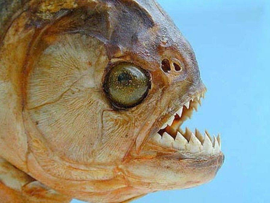 В природе пираньи – грозные хищники, способные с легкостью перекусить даже палец взрослого человека. Их острые зубы срезают плоть подобно лезвию, а челюсти настолько мощные, что откусывают толстые рыболовные крючки.