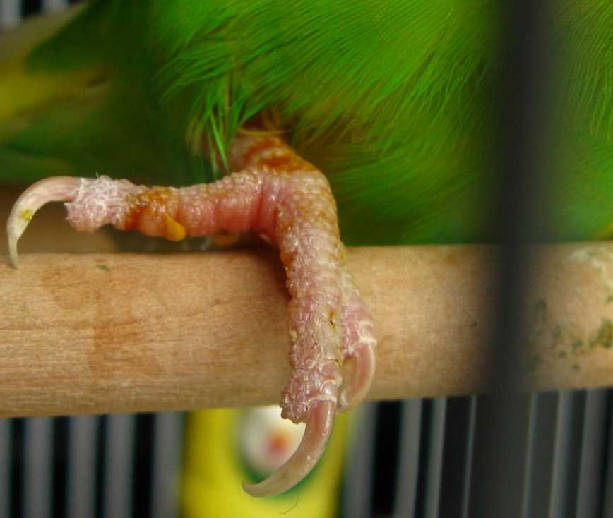 Лечение от чесотки несложное, но длительное. Пораженные лапки попугая обрабатывают аверсектиновой мазью по особой схеме. К сожалению, выздоровление не гарантирует, что попугай в будущем не подхватит вновь эту болезнь. Клещей переносят на ветках дерева, инвентаре, бывшем в употреблении. Заразиться можно от других птиц при несоблюдении карантина.