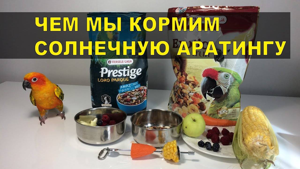 Важно следить за наполненностью поилки и свежестью питьевой воды. Запрещено кормить аратингу любой пищей животного происхождения, колбасными изделиями, сладостями, соленой едой, снеками и хлебом