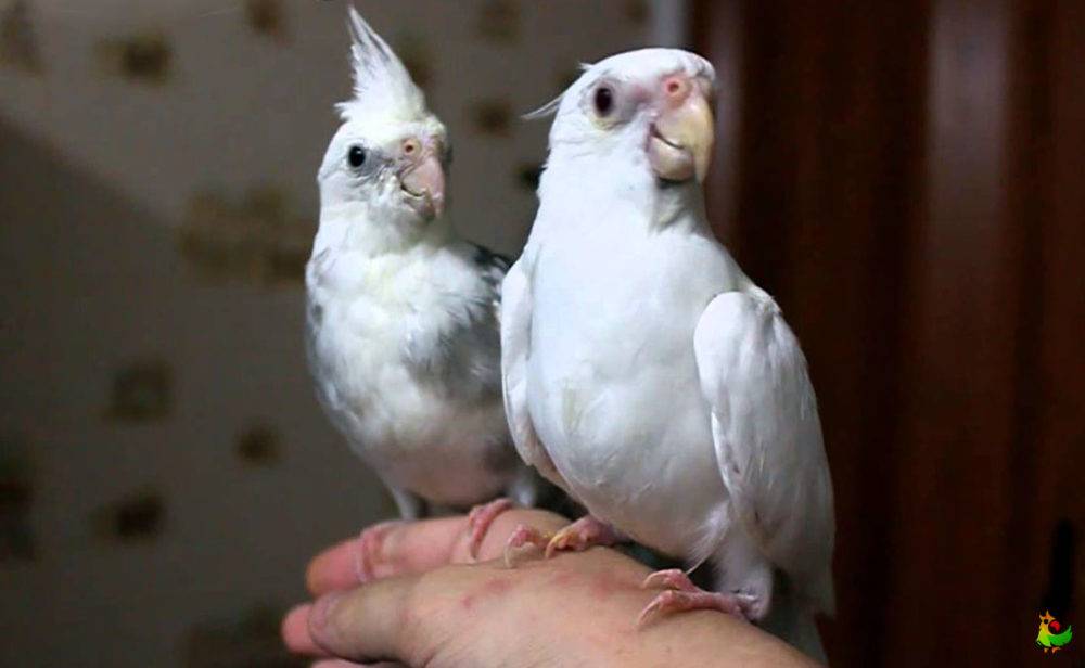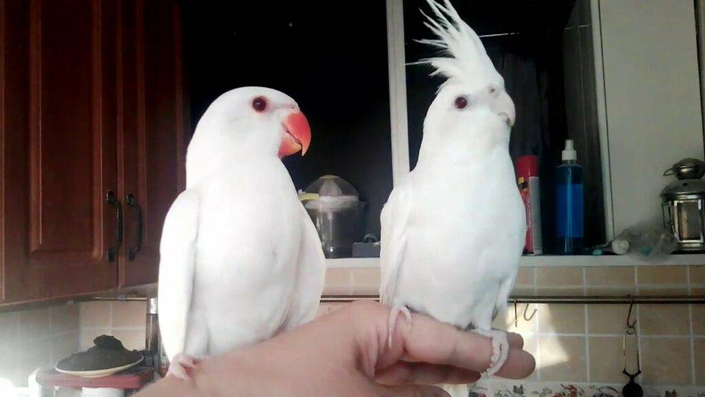 - Альбина. Это альбинос, обладатель белого или нежно-кремового оперения и красных глаз. Эффект достигается, как и у людей, из-за отсутствия красящего пигмента. Это попугай с хохолком жёлтого цвета, отлично сочетающимся с окраской, а самка в добавок имеет светло-жёлтые пятна на крыльях.