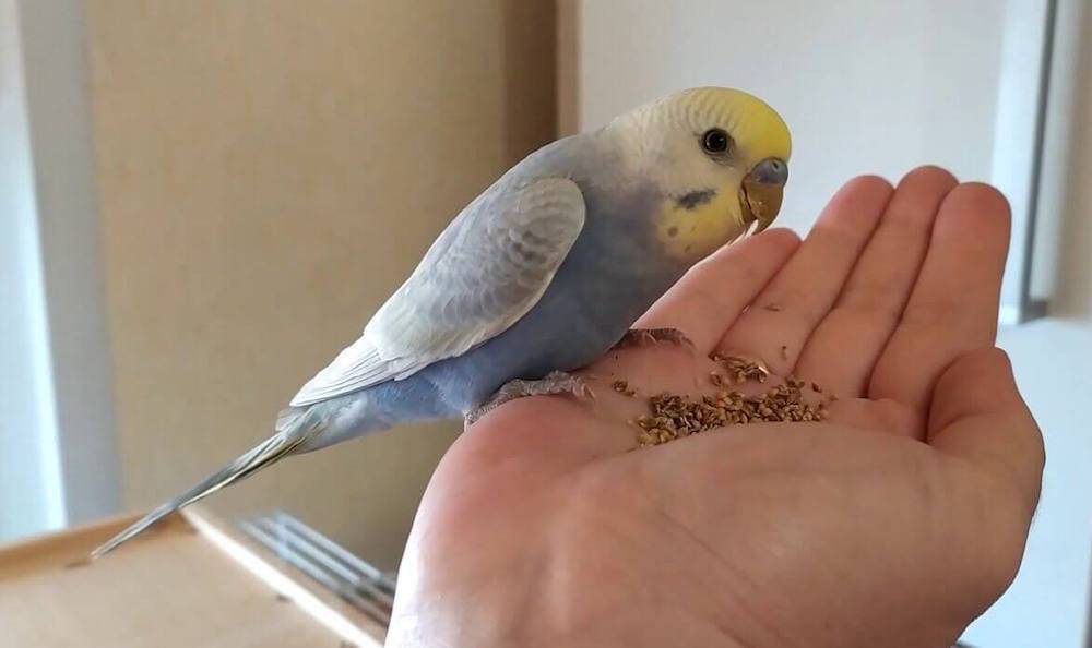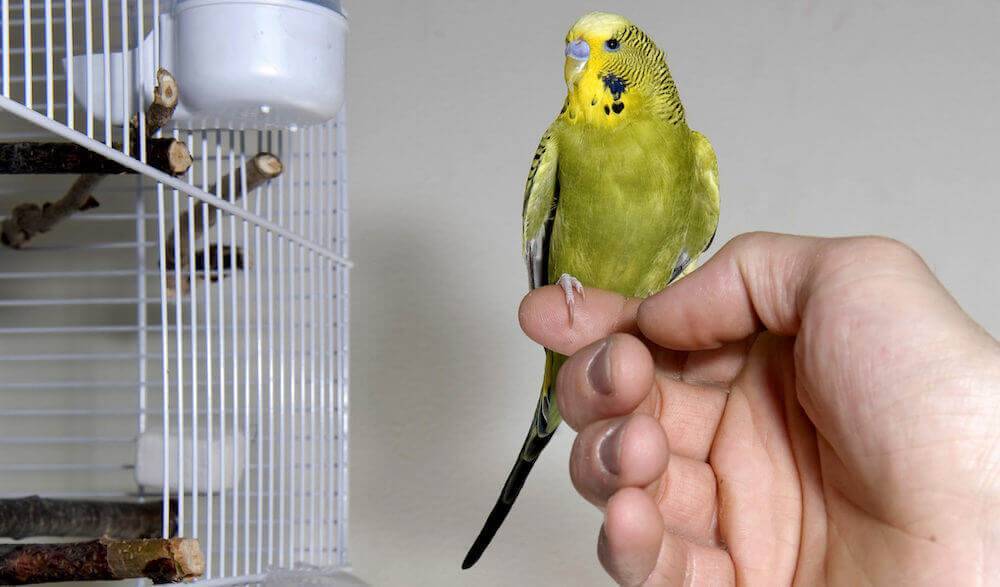 - Когда птичка перестанет бояться, спокойно начнет брать еду с руки, садиться на ладонь, можно переходить к следующему этапу.
