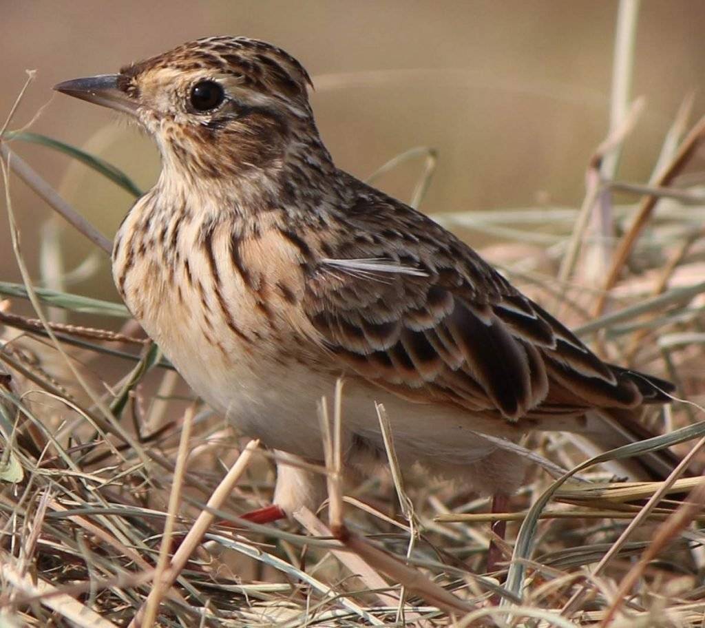 Оперение жаворонка маскирует его на фоне земли и сухой травы