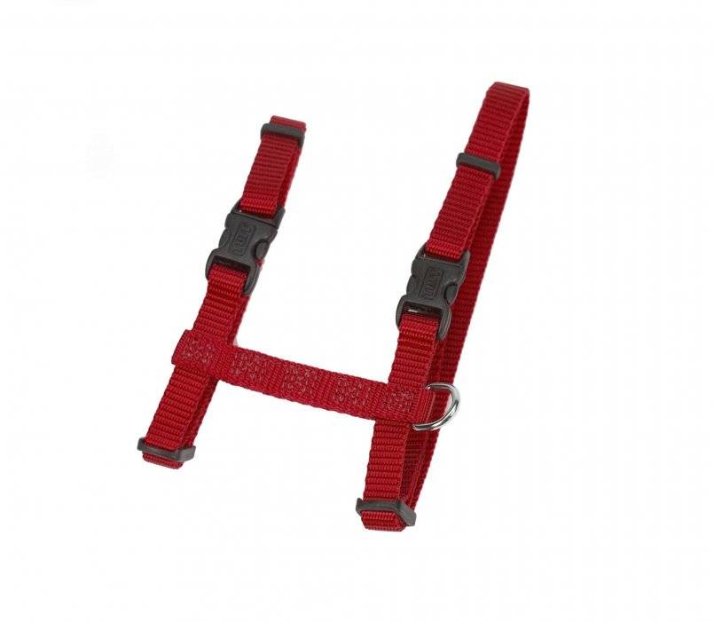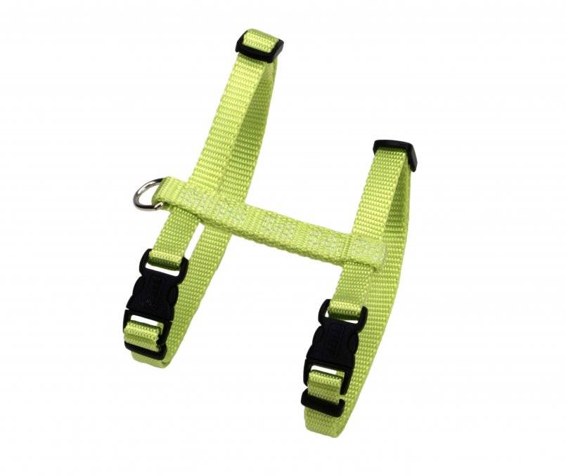 - Н образная шлейка по форме напоминает букву Н, то есть соединительные кольца имеют еще одно дополнительное крепление в виде перемычки. Такое устройство позволяет снизить нагрузку на шею.