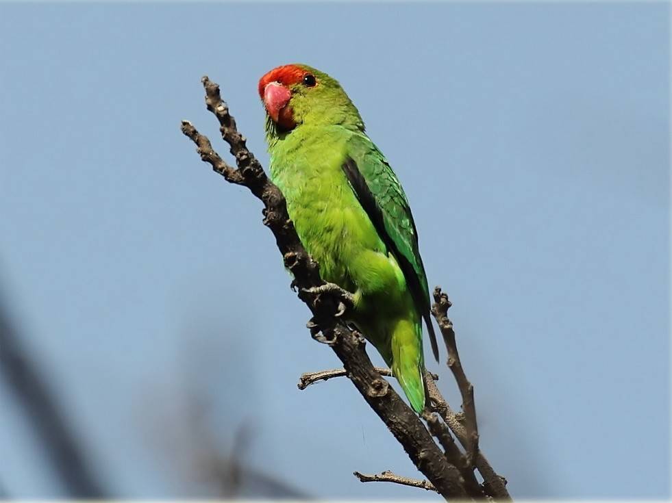 Часто встречающийся и легко приручаемый вид, представители которого отличаются характерными оранжево-розовыми отметинами на лбу, горле и щеках. Природный цвет их перьев — зеленый, но селекционерами были искусственно выведены породы с голубым, оранжевым, кремовым, желтым и многоцветным оперением.
