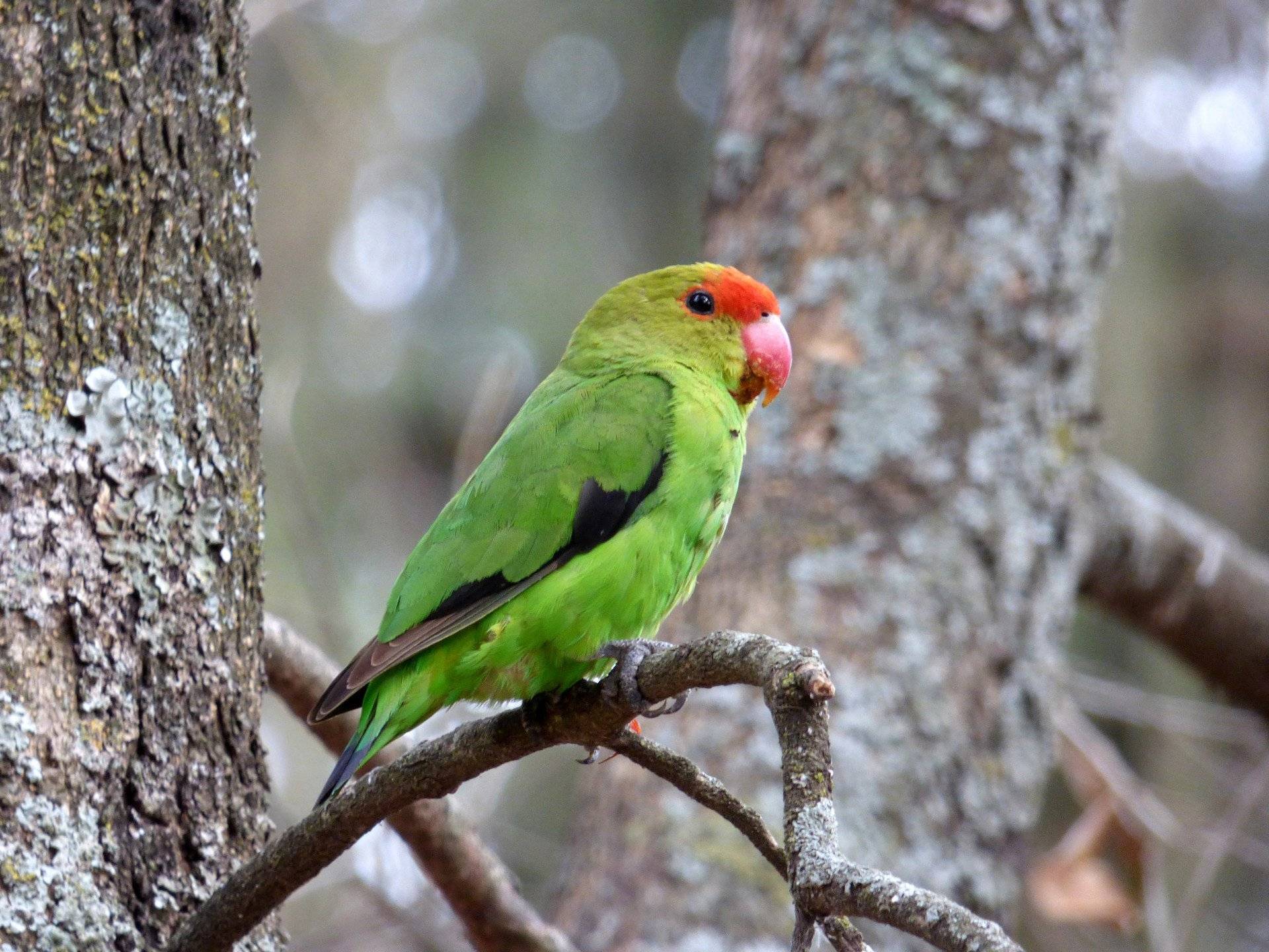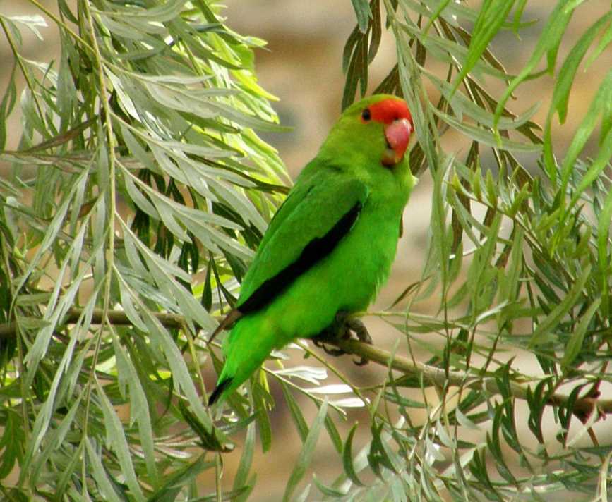 Самый мелкий подвид неразлучников. Лилианы — птички с зеленым окрасом тела, желтым «воротником» и клубнично-красной головой.
