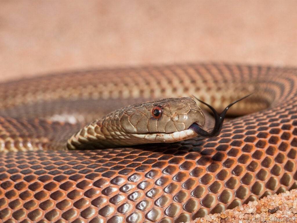 Мулга также обитает в Австралии и принадлежит к роду чёрных змей. Самая длинная в истории мулга имела длину 3,35 метра, хотя средней считается от 1,8 до 2,4 метра. В Австралии есть более ядовитые змеи, но мулга компенсирует это сильным укусом и привычкой жевать добычу, чтобы впрыснуть больше яда, который разрушает клетки крови, повреждает мышечную ткань и обладает умеренной нейротоксичностью. В целом вы чувствуете себя не очень хорошо. Противоядие лучше вводить от чёрной змеи, поскольку оно более эффективно. И, пожалуй, это единственная ядовитая змея в этом списке, которая ведёт себя агрессивно при любом раскладе, даже если её не провоцировать.