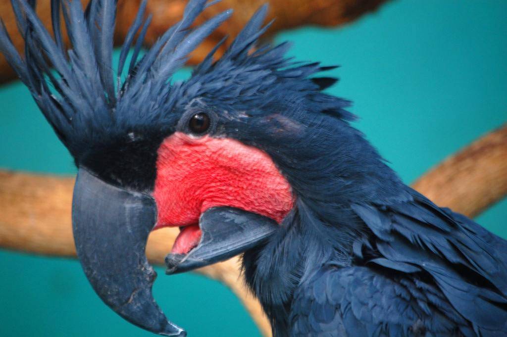 - Смоляной (пальмовый) какаду – это красивейший представитель семейства. Его рот достигает в длину 10 см, это настоящий рекорд! Пернатые обитают в Новой Гвинее и Австралии. Пернатые обладают величественной черной окраской с зеленоватым оттенком. Под глазами лупить яркие красные пятна.