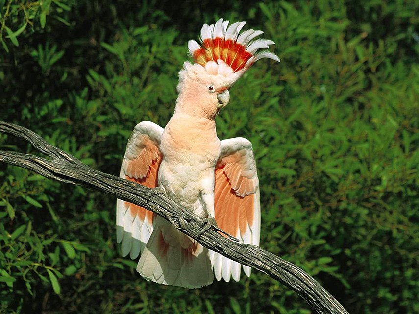 - Какаду инка обладает снежно-розовой расцветкой. Разные оттенки плавно сменяют друг друга, делая покров перламутровым. Длина тела составляет около 40 см. На голове расположен хохолок с белыми перьями числом краям и яркими посередине. Эти попугаи могут жить даже в пустынных районах Австралии, становой хребет, чтобы рядом был водоем. Птицы предпочитают селиться в кронах деревьев. Летают редкостно.