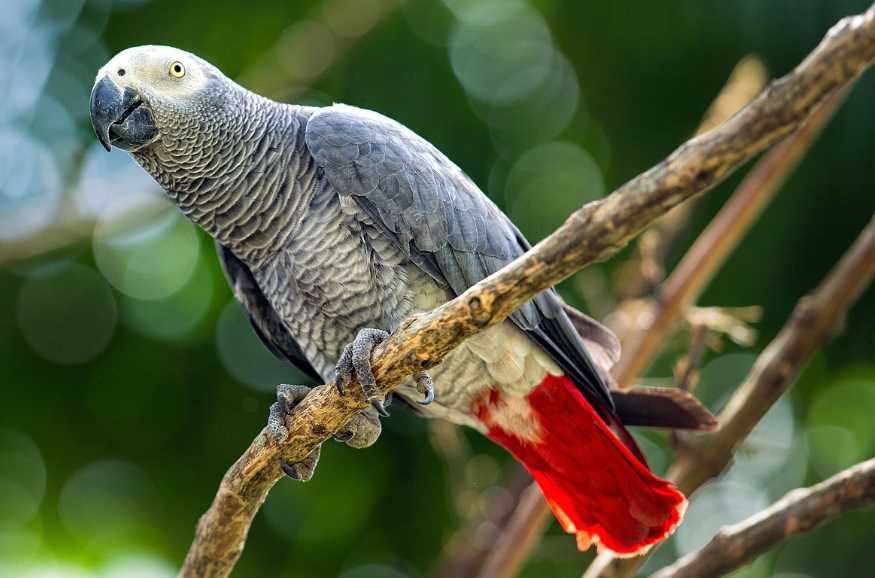 Второе название – Серый попугай. При длине около 35 сантиметров размах крыльев достигает 65 сантиметров. Имеет два главенствующих цвета в оперении: серый основной и красный цвет в оперении хвоста. Проживает в больших лесах Западной Африки.