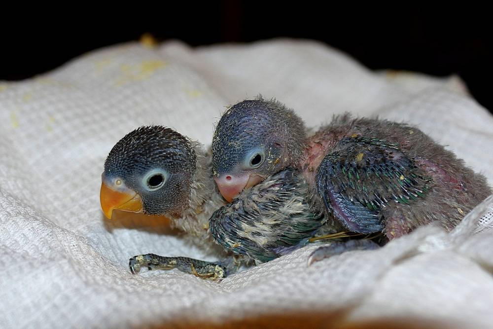 Яйцо попугая весит примерно 2,5 грамма, а новорожденный птенец и того меньше – 2 грамма. Вылупляются они с помощью яйцевого зоба, который представляет собой уплотнение на клювике. Пробивая им скорлупу, птенцы оказываются снаружи, где полностью беспомощны. Они фактически не двигаются, слепы и без перьев. Новоиспеченные родители выкармливают их полупереваренной пищей, которая называется зобным молочком.