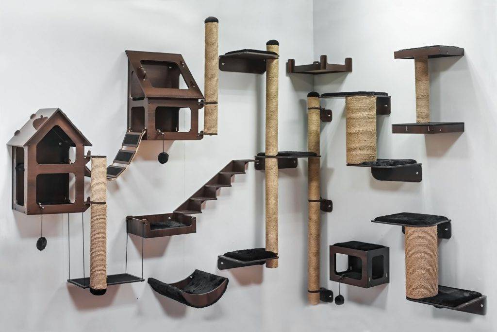 Большой популярностью пользуются многоуровневые комплексы для кошек. Это не только оптимальное место для отдыха, но и игровая зона, где активное животное может выплеснуть свою энергию. Обычно они оснащены спальным местом, многоуровневыми полками, столбиками, по которым можно лазать и точить об них когти, иногда – тоннелями и гамаками. Хороший комплекс для кошек стоит недешево, однако его можно соорудить и своими силами. Для изготовления каркаса используют фанеру и трубы из-под линолеума, для обивки – войлок, ковролин, сизалевую или джутовую веревку.