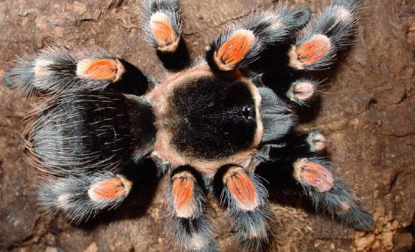 - Мексиканский. Пушистый, длина брюшка до 14 см, черно-серого цвета, сгибы лапок рыжие (второе название паука – «красноколенный тарантул»). Отличаются медленным ростом и созреванием: самцы способны к оплодотворению в возрасте 4-х лет, редко живут дольше 10, самки могут давать потомство в 6-7 лет, доживают до 20-30 лет. В неволе созревание происходит быстрее, что сокращает продолжительность жизни.