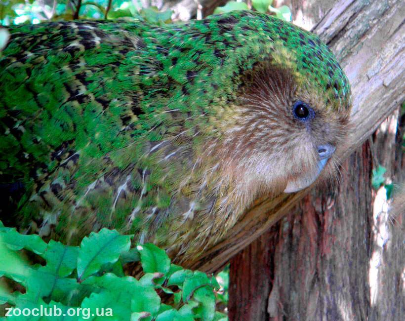 Необычный и редкий попугай из Новой Зеландии вида какапо строением головы напоминает сову, отсюда его второе название – совиный. Это очень интересный, даже уникальный вид попугаеобразных: не летает из-за слабых крыльев, ведет ночной образ жизни, самки в два раза меньше самцов. Голос какапо напоминает одновременно карканье совы и похрюкивание свиньи.