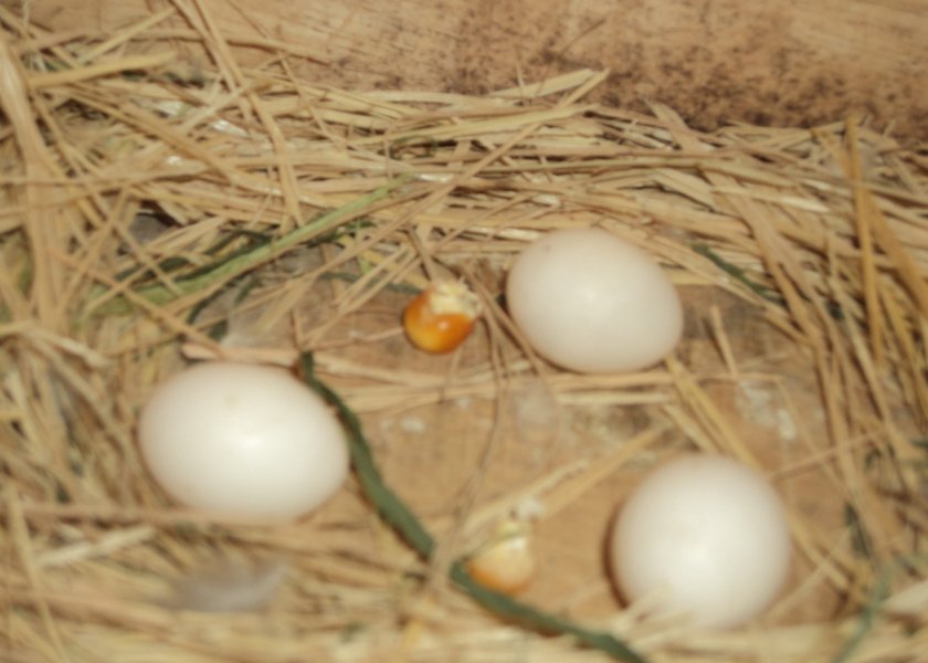 Очень редко бывает, что птица съедает свои же яйца. Тогда в гнездовье нужно сделать двойное дно. В одном из них необходимо сделать дырку, чтобы снесённые яйца проваливались вниз. Главное, сделать мягкую подстилку из сена, опилок, ваты. Потом эти яйца можно подложить другой самке для высиживания.