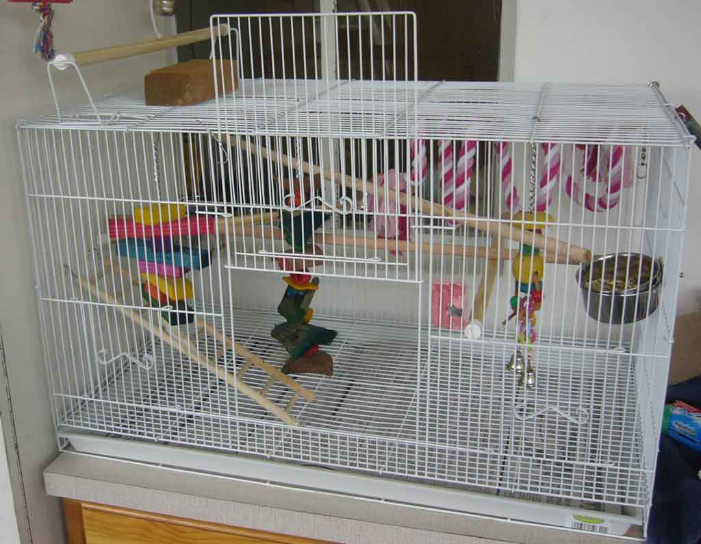 Обустроить клетку для волнистого попугая не сложно. Лучше, если дно клетки волнистого попугая будет сплошным (без прутьев), иначе есть риск травмы лапок попугая. Снизу клетка обязательно должна иметь поддон, что значительно упростит уборку. Внутри клетки необходимо разместить хотя бы 2 деревянные жердочки диаметром не менее 1,5 см. Их следует расположить на разном уровне и желательно не над кормушками.