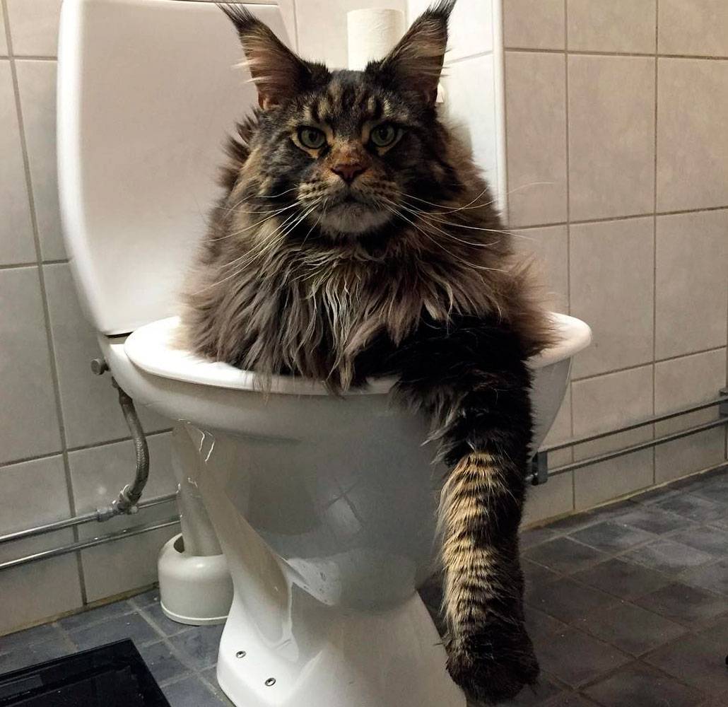 Туалет мейн куна. Возможно, излишне сообщать, что доступ к туалету у куна должен быть беспрепятственным 24/7. Если вы делаете особую кошачью дверцу в двери вашего санузла, не забывайте, что кошка мейн кун очень скоро достигнет размеров средней собаки. Сам лоток старайтесь выбрать побольше, с высокими краями (подойдет размер 40х80, с бортиками 10 см) – куны любят от души покопаться в лотке, и содержимое менее высокого лотка будет постоянно раскидано вокруг. Мейн куны очень чистоплотны, и грязных лотков не приемлют.