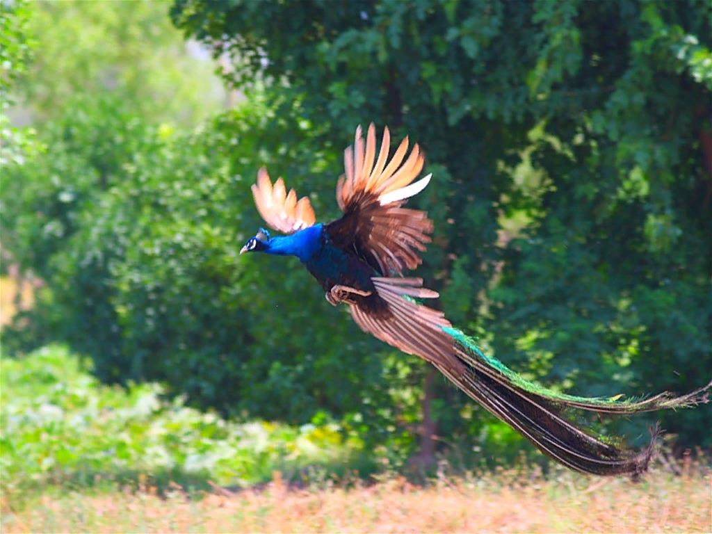 Летящий павлин, особенно с длинным и струящимся по ветру хвостом — зрелище невероятно красивое.