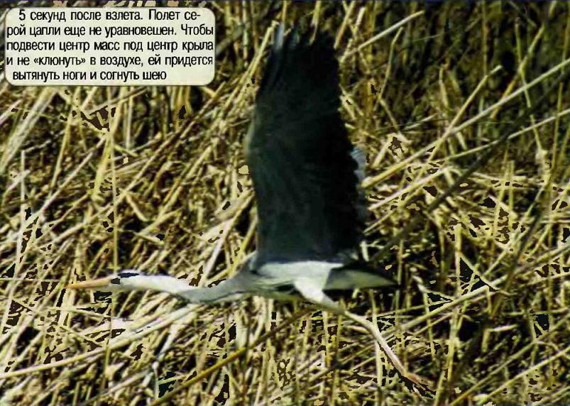 5 секунд после взлета. Полет серой цапли еще не уравновешен. Чтобы подвести центр масс под центр крыла и не «клюнуть» в воздухе, ей придется , вытянуть ноги и согнуть шею.