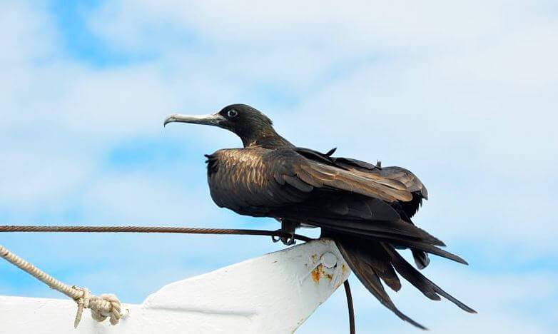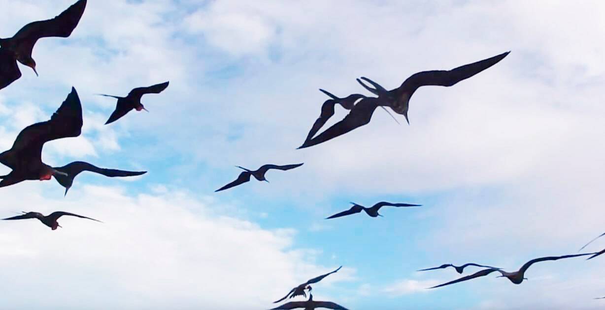 Фрегаты — превосходные летуны и акробаты. Темно-коричневые остроконечные крылья с двухметровым размахом поднимают птиц на километровую высоту, где они долго парят кругами.