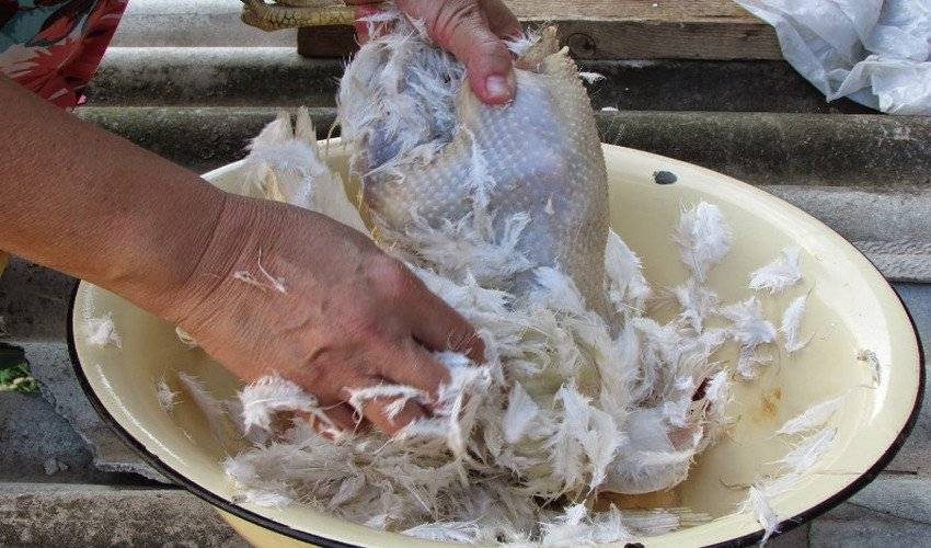 После забоя птицу следует ощипать. Этот процесс также можно осуществить несколькими способами. Наиболее лёгкий — ощипать сразу после убоя всухую. Чтобы облегчить работу, лучше использовать такой инструмент, как пуходёрка.