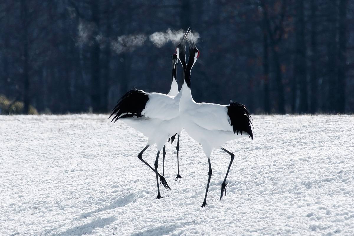 Сезон размножения у японских журавлей обычно начинается с ритуальной песни, которую заводит самец. Он мелодично поет (курлычет), запрокидывая голову. Спустя некоторое время к самцу присоединяется самка. Она старается повторять звуки, издаваемые партнером. Потом начинается обоюдный брачный танец, состоящий из множественных пируэтов, скачков, хлопанья крыльями, поклонов.