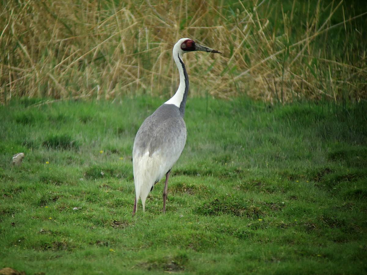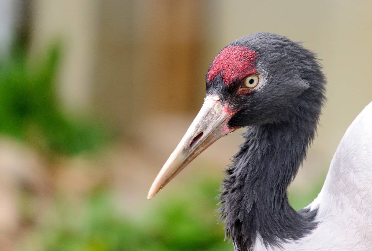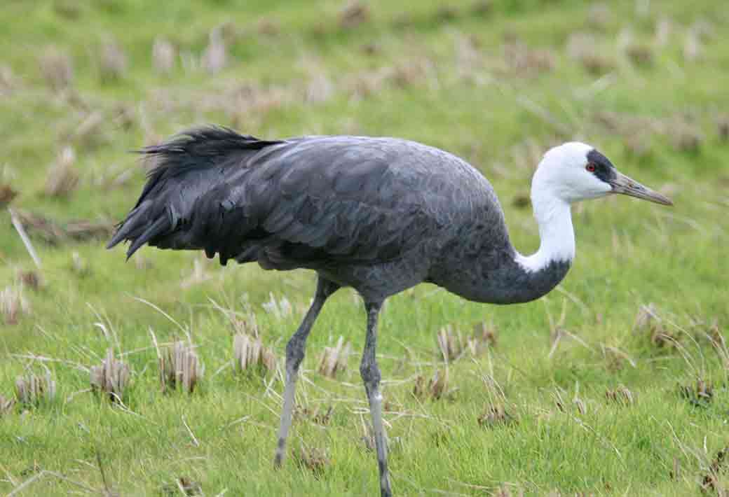 Малочисленный, редкий вид, открытый только в 1974 году. Птицы гнездятся на востоке России и в северном Китае, зимуют на японском острове Кюсю. Это относительно мелкие журавли, высотой не больше 100 см и массой около 3, 75 г. Основное оперение темно-серое с синевой, голова и шея белые. Кончики кроющих перьев хвоста и маховых крыльев окрашены в черный цвет. Конечности черно-коричневые, Клюв окрашен интересно: розовый в основании, постепенно становится зеленоватым, а к кончику желто-зеленым.