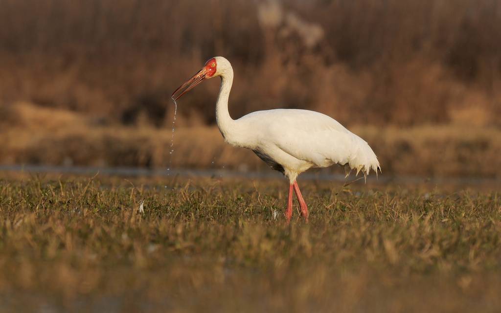Вымирающий вид журавлей, которые гнездятся исключительно на севере России, а зимуют в Китае. Это крупные птицы, высотой до 140 см и весом от 5 до 8,6 кг. Основной окрас оперения белый, только кончики маховых перьев черные. Отличительная видовая особенность – очень длинный клюв ярко-красного цвета с зазубренным кончиком. Длинные ноги стерхов окрашены в красновато-розовый цвет.
